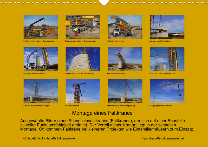 Ausgewählte Bilder eines Schnelleinsatzkranes (Faltkranes), der sich auf einer Baustelle zu voller Funktionsfähigkeit entfaltet. Der Vorteil dieser Kranart liegt in der schnellen Montage. Oft kommen Faltkräne bei kleineren Projekten wie Einfamilienhäusern zum Einsatz.