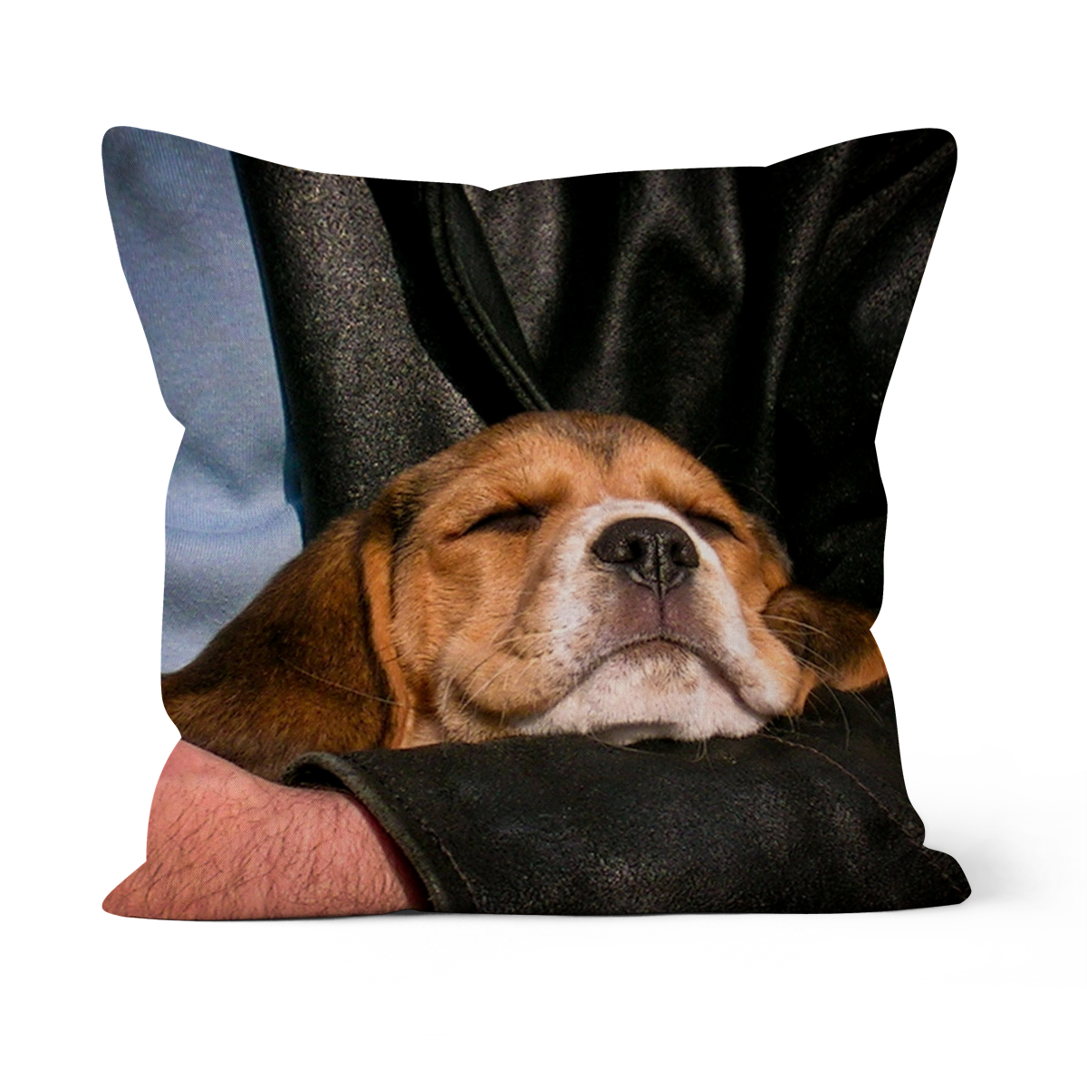 Ein süßer knuffiger Beaglewelpe schläft im Arm