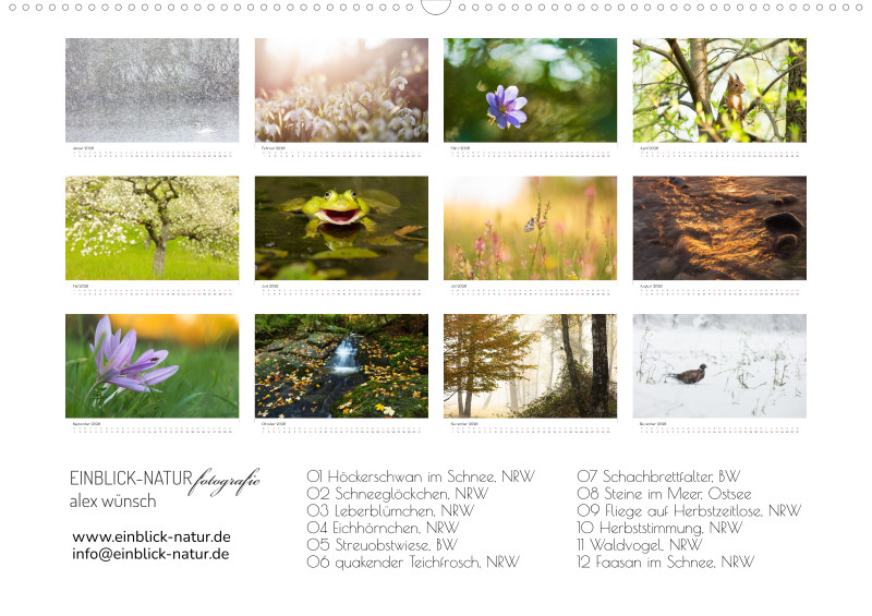 Mit diesem Kalender holt ihr euch die Natur in eure vier Wände. Die Bilder zeigen meine ganz persönlichen Naturmomente und halten Augenblicke fest, in denen Morgendunst durch den Wald schwebt, Blumen in ihrer Lebendigkeit leuchten und Tiere für einen Herzschlag lang ihre Welt mit uns teilen. Alle Aufnahmen sind echte Naturdokumente und thematisch auf die jeweiligen Jahreszeiten abgestimmt. Die meisten Bilder entstanden in Nordrhein-Westfalen.