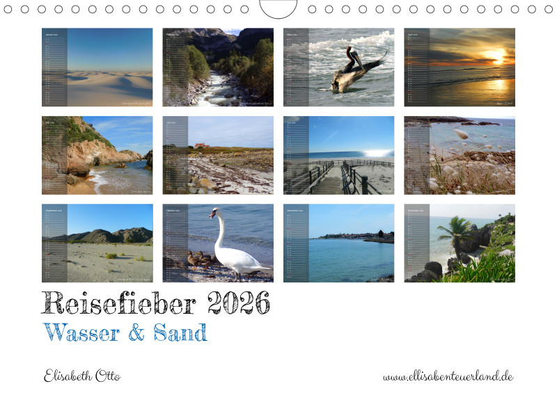 Reisefieber - Wasser & Sand: Fotos aus den verschiedensten Ländern und Winkeln der Welt, welche auf Reisen entstanden sind, mit dem Schwerpunkt Wasser und Sand. Wasser und Sand gehören manchmal zusammen - zum Beispiel an unzähligen traumhaften Stränden und Küsten. Ebenso stellen sie aber auch einen großen Kontrast dar - auch Wüsten sind faszinierende Lebensräume. Der Kalender soll u.a. auch die Vielfalt und Schönheit der Erde zeigen, den Entdeckergeist wecken und inspirieren.