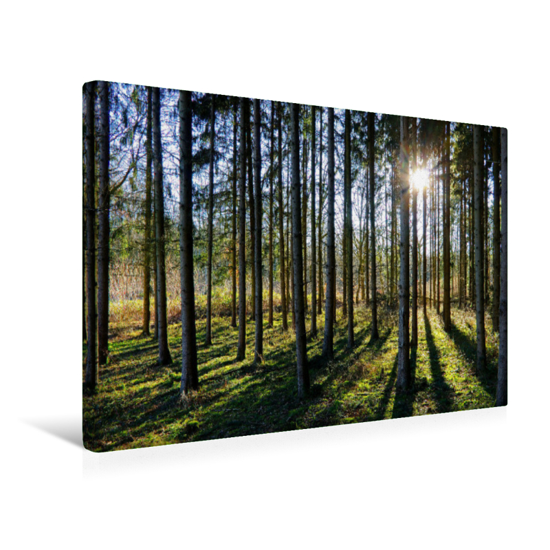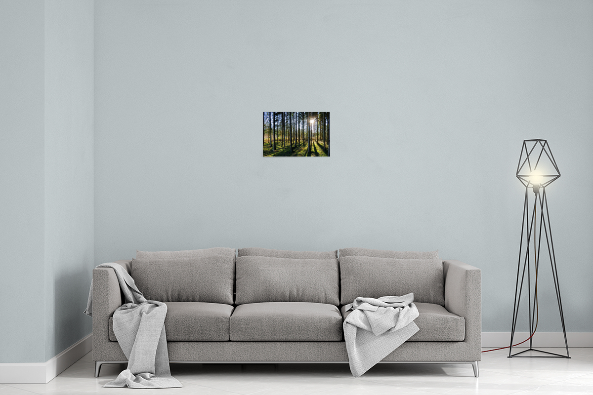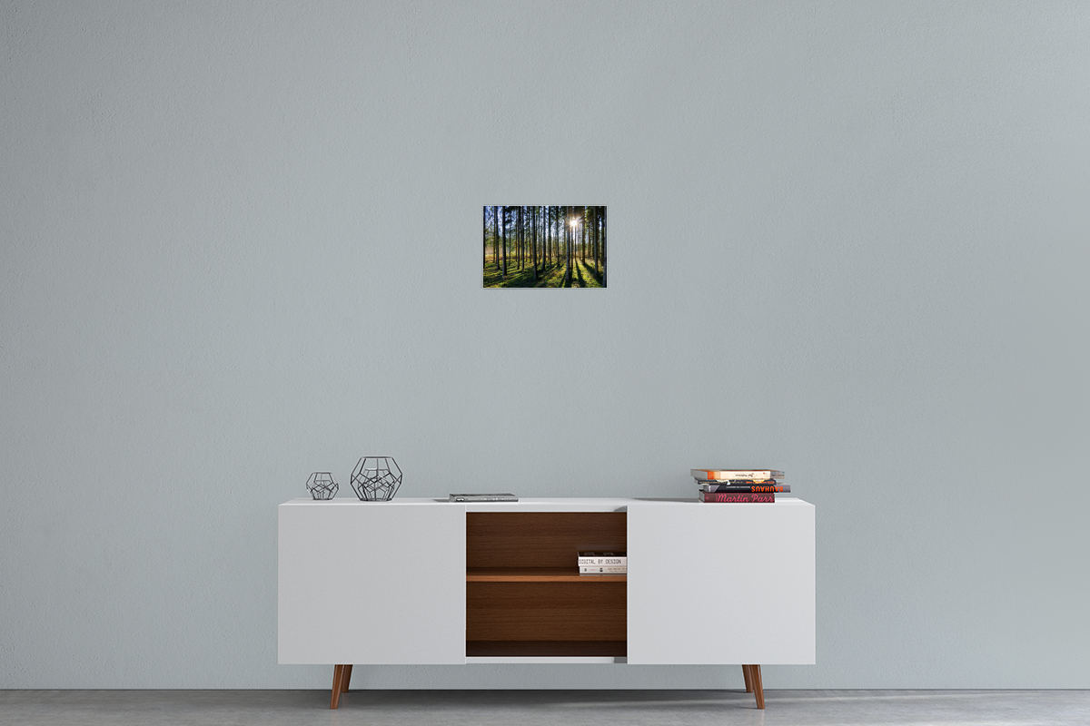 Diese Premium Leinwand mit dem Titel Wald und Sonne bietet Natur pur. Ideal für den Flur oder das Gästezimmer in der eigenen Wohnung. Leinwand mit leuchtende Farben auf Keilrahmen aufgezogen.