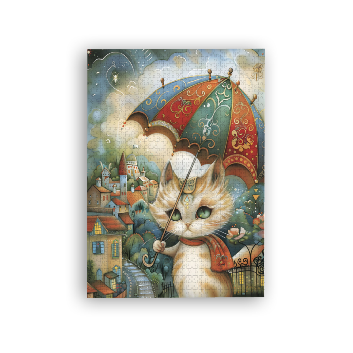 Dieses wunderschöne Motiv der gemütlich im Regen spazierenden Katze bringt überall ein gemütliches Puzzle-Erlebnis, auch wenns mal draußen regnet.