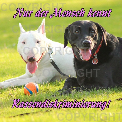 Ein weißer Bull-Terrier und ein schwarzer Labbi-Mix liegen friedlich nebeneinander auf einer Wiese, denn nur der Mensch kennt Rassendiskriminierung! Das Motiv gibt es bei uns auch als Grußkarte.