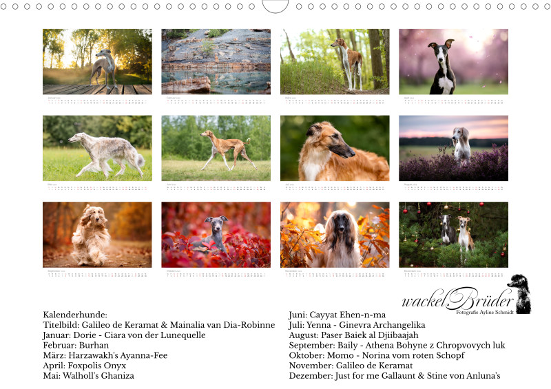 Meine Leidenschaft für Windhunde ist sehr groß. Diese eleganten und schnellen Hunde faszinieren mich einfach. 2024 begann ich mit meinem Projekt "Windhunde und mediterrane Rassen" und durfte dabei schon wunderschöne und liebenswerte Hunde kennenlernen. Doch vor allem die Windhundliebhaber und ihre pure Liebe und Überzeugung für ihren Windhund macht dieses Projekt so besonders für mich. Mit diesem ersten Kalender nehme ich Sie mit auf meine ersten wundervollen Momente dieses Projektes mit verschiedenen so einzigartigen Windhundrassen. Liebe Grüße, Ayline von den wackelBrüdern